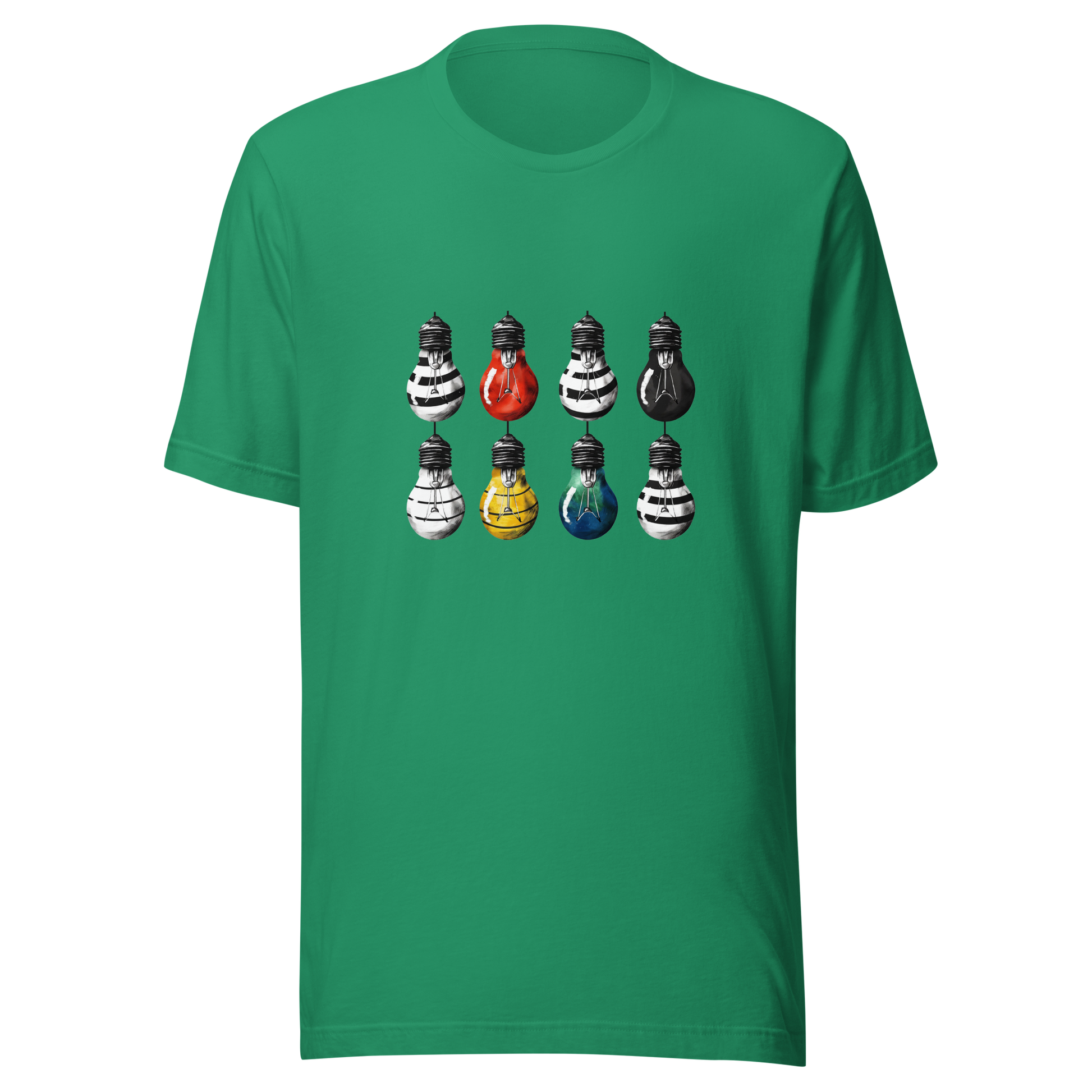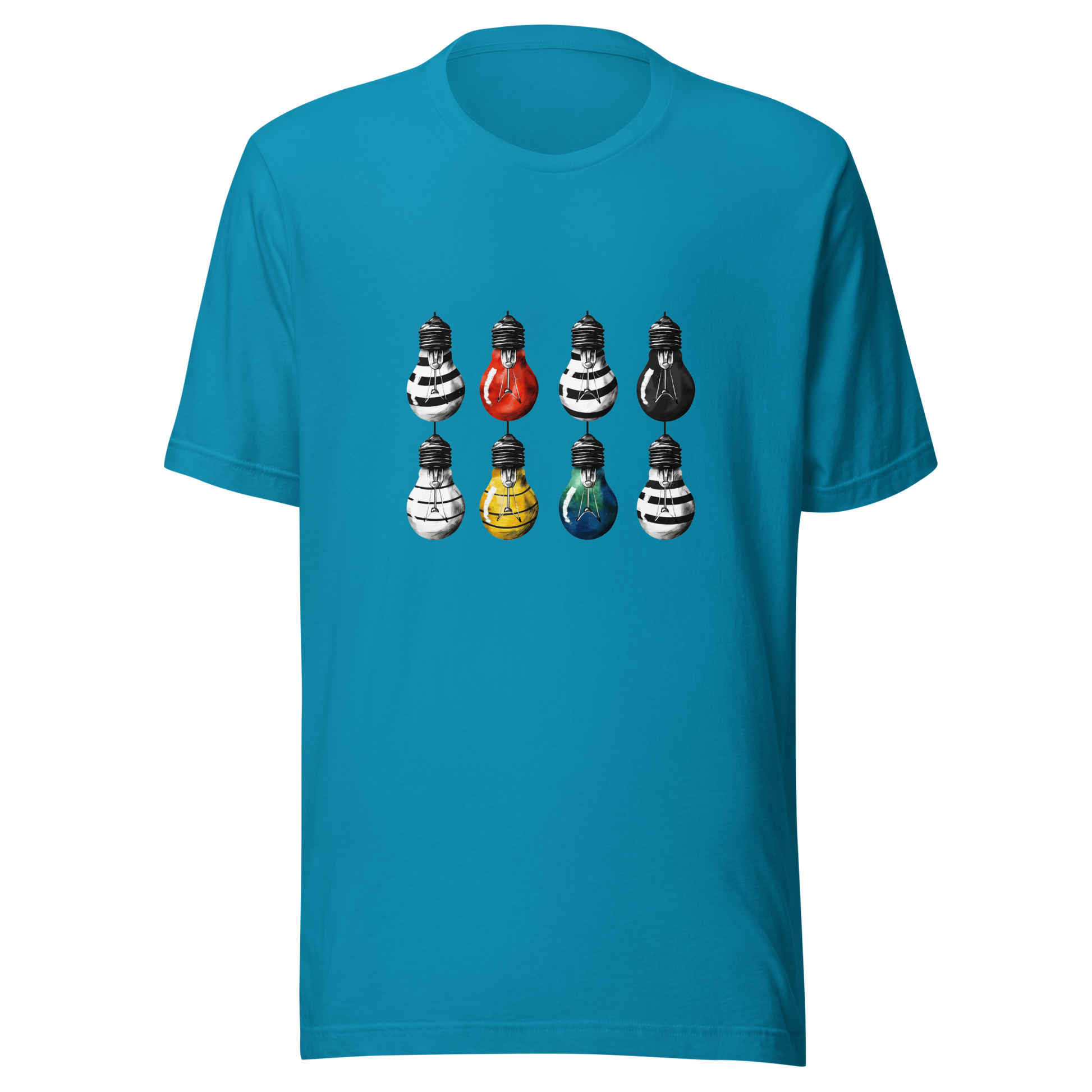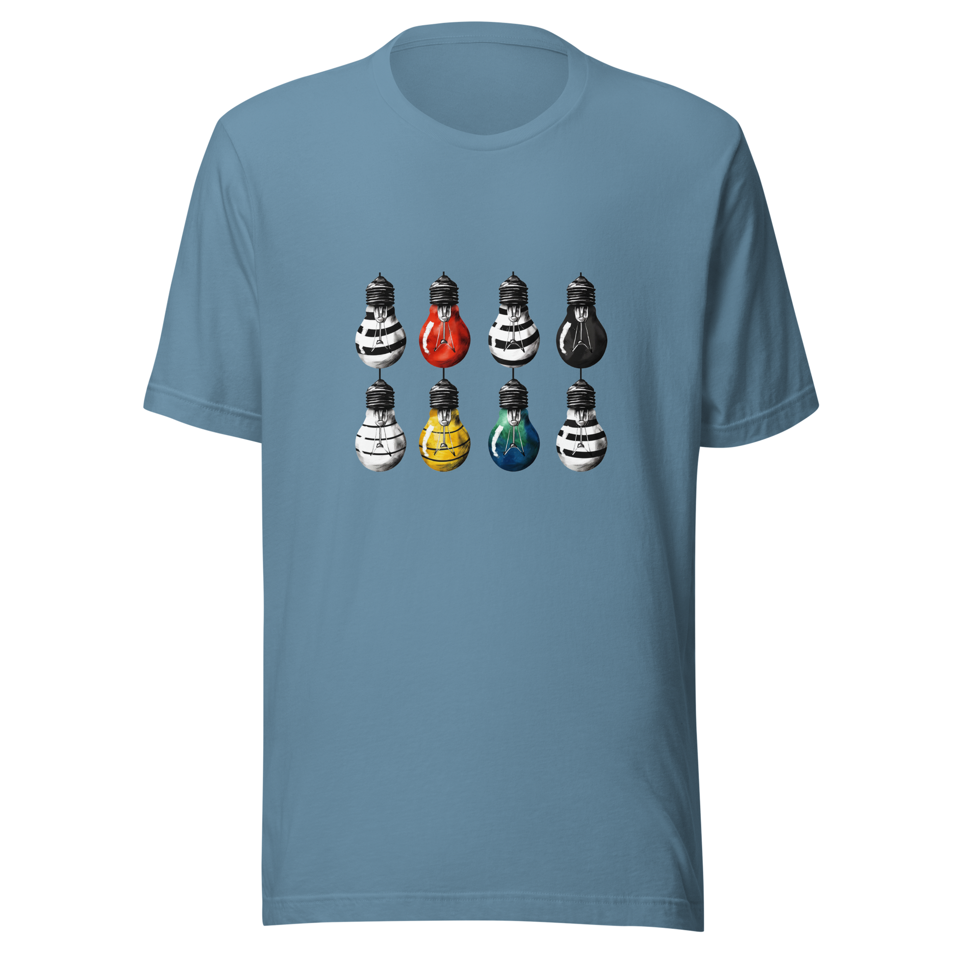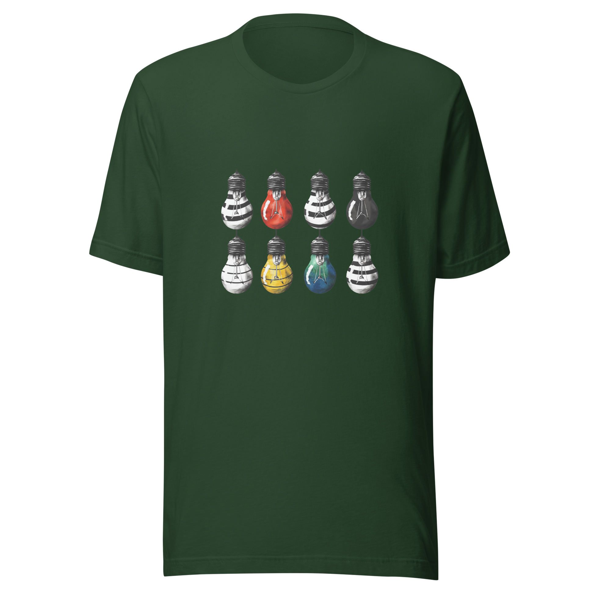 Step into creativity with this t-shirt adorned with several beautifully designed light bulbs. Each bulb radiates its unique brilliance, inspiring thoughts of bright ideas.
