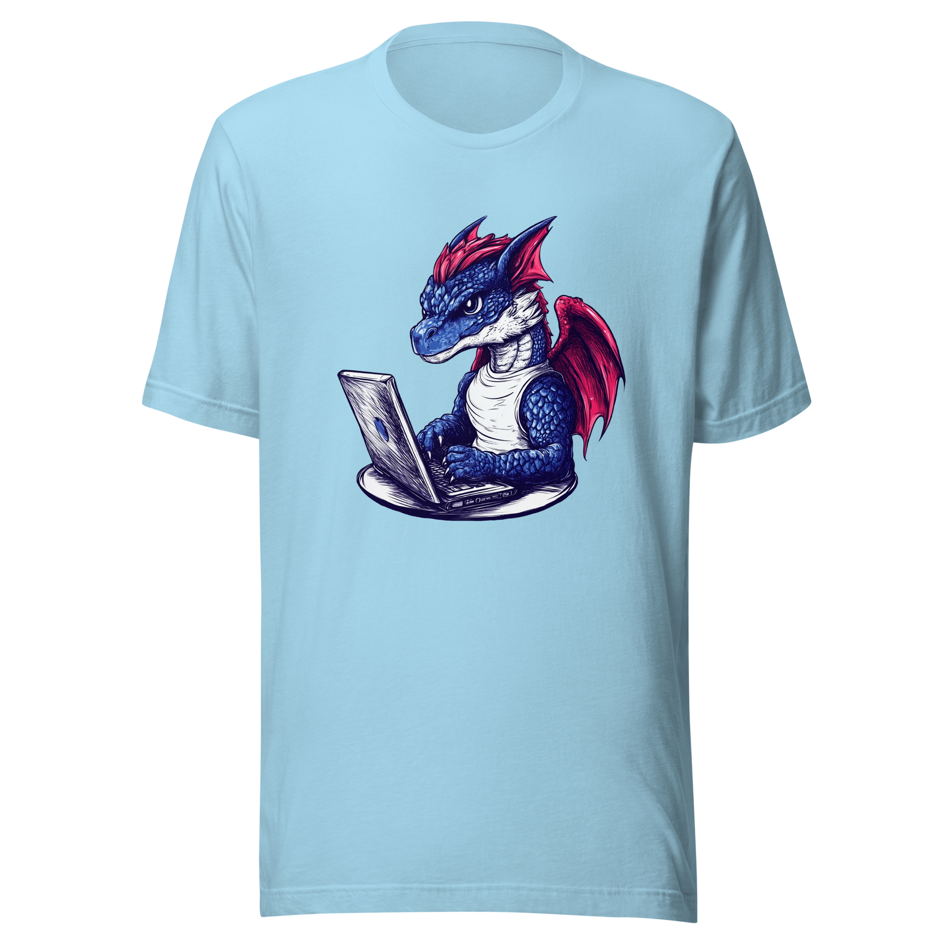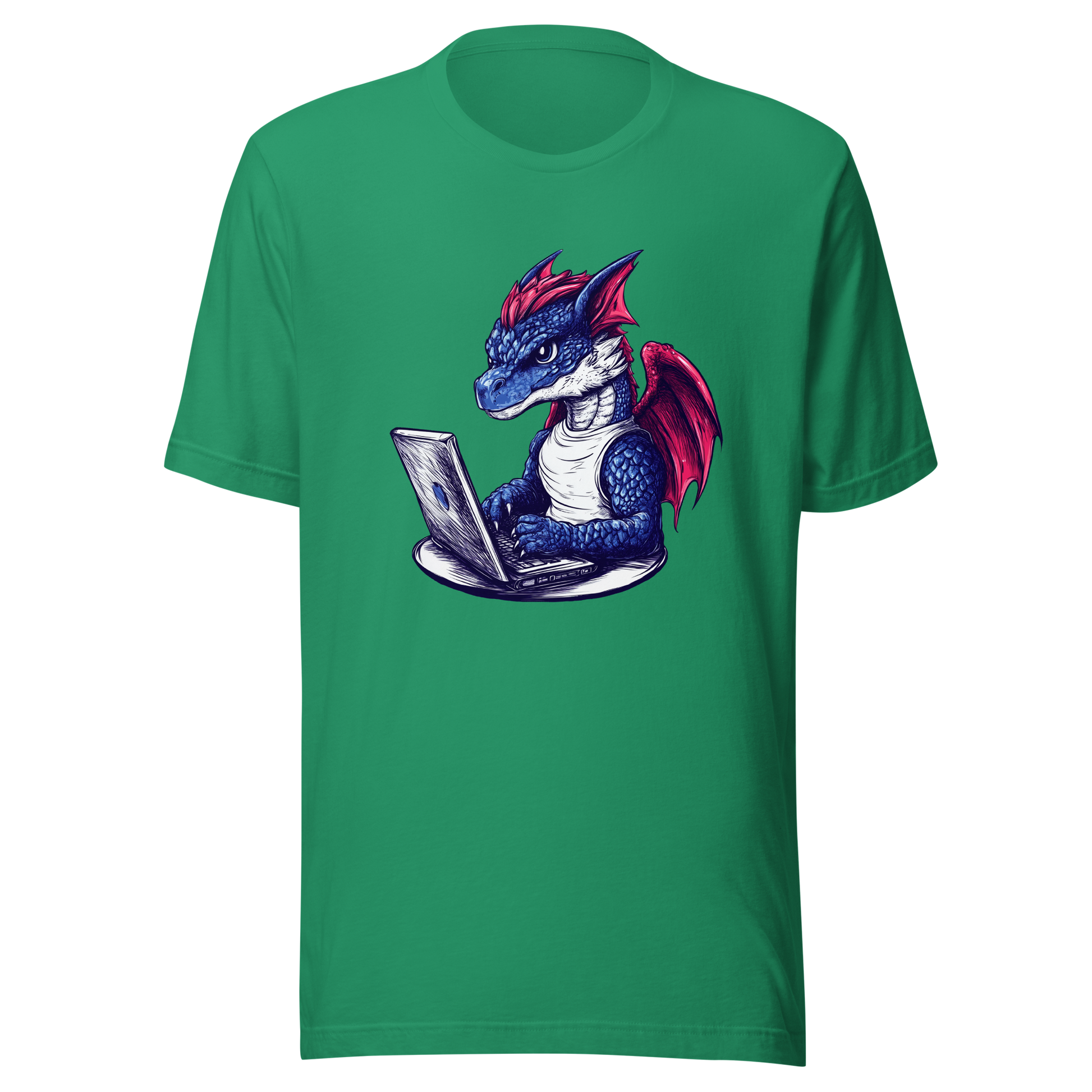 This T-shirt showcases a fierce dragon with a laptop. Perfect for programmers who aren’t just solving bugs, but conquering them with legendary power.
