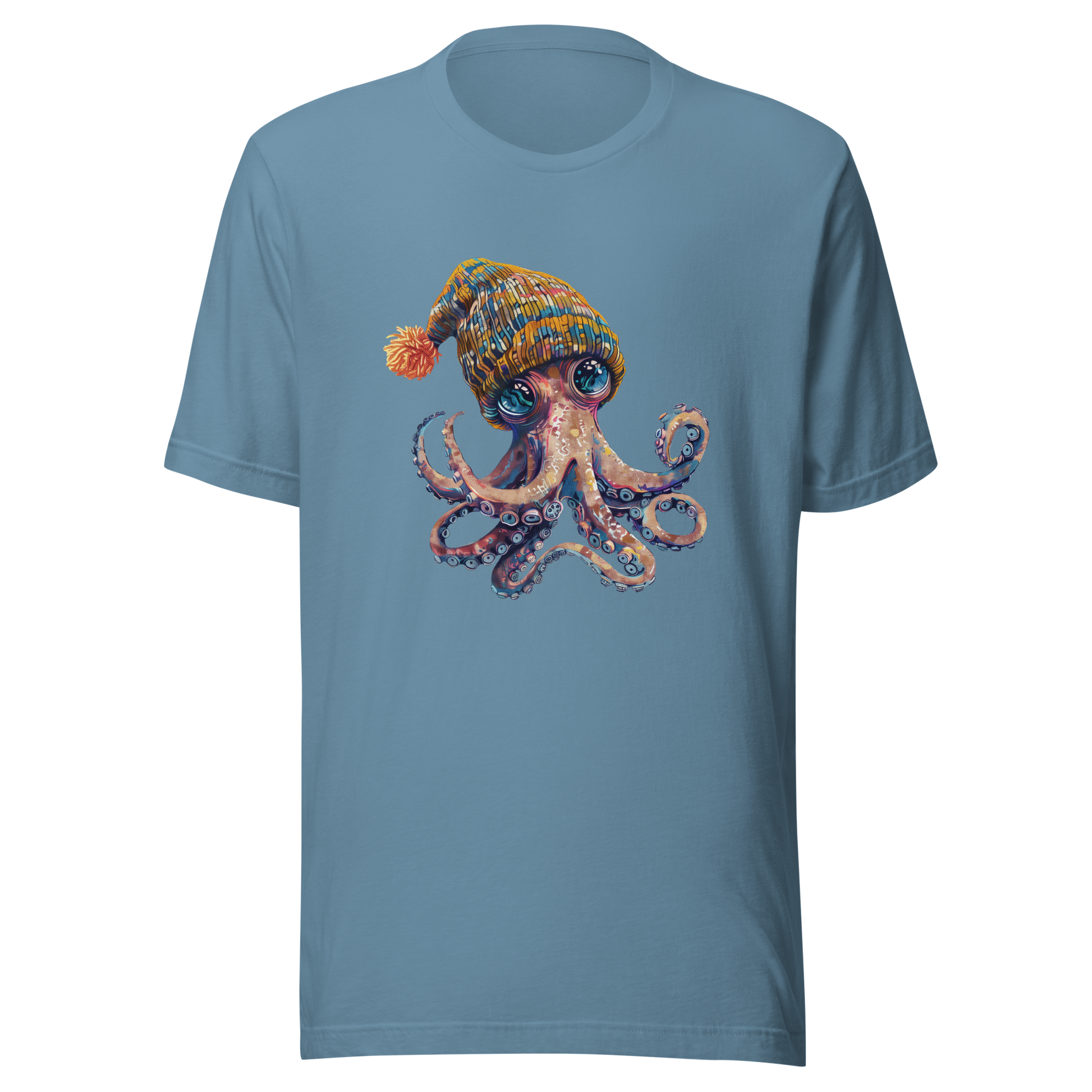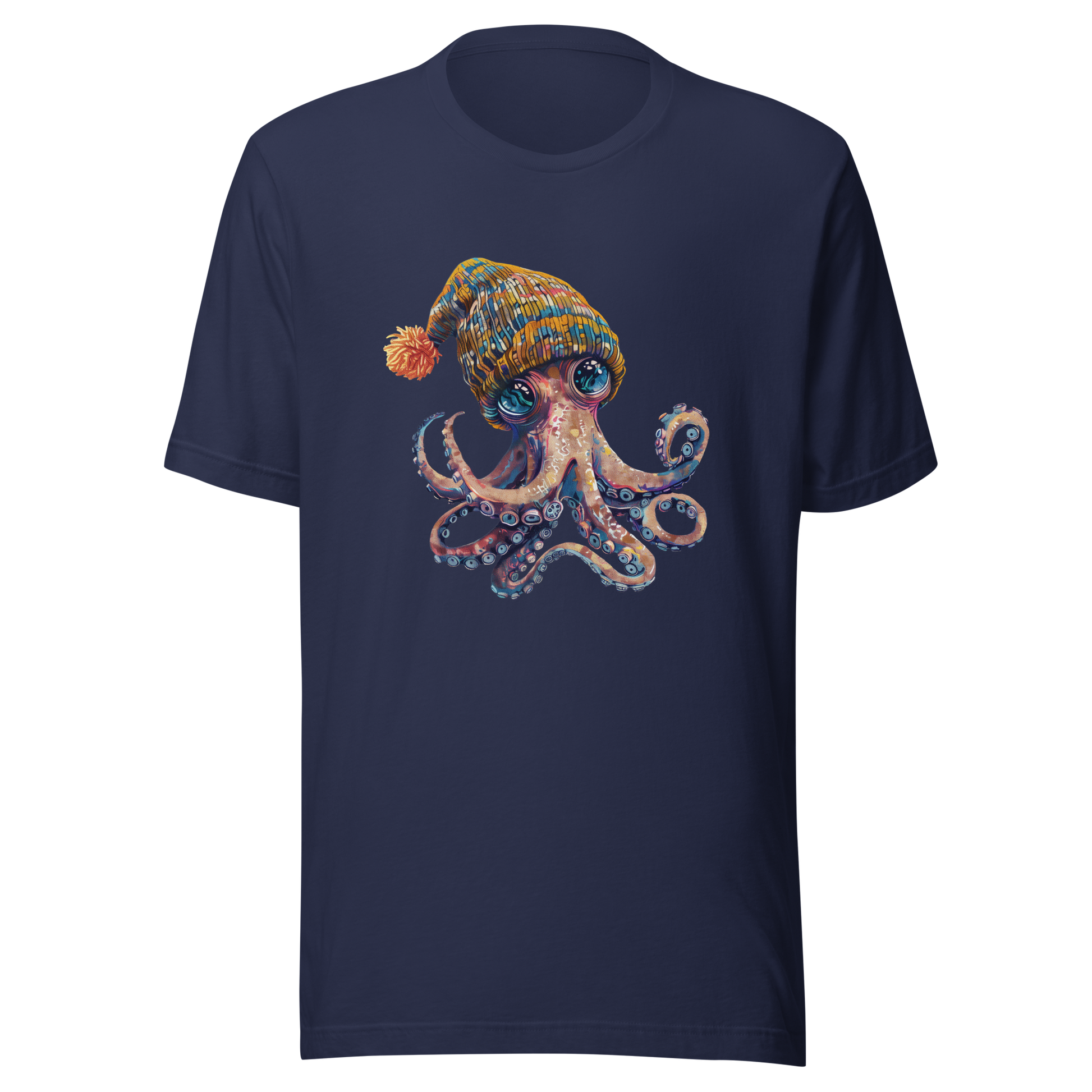 Meet the coolest octopus in the ocean! This t-shirt shows off a colorful, playful octopus in a warm hat, perfect for adding a fun twist to your casual outfits.