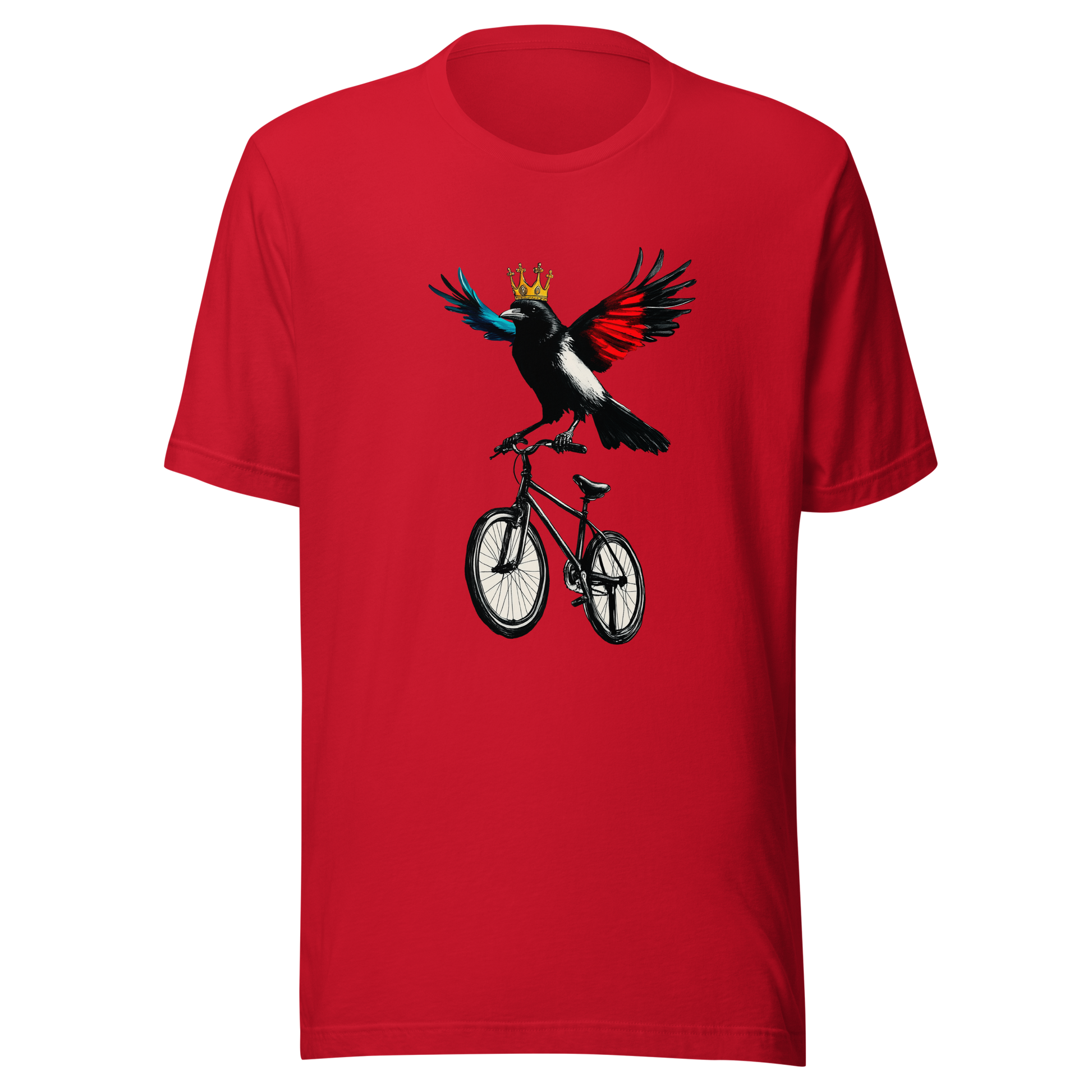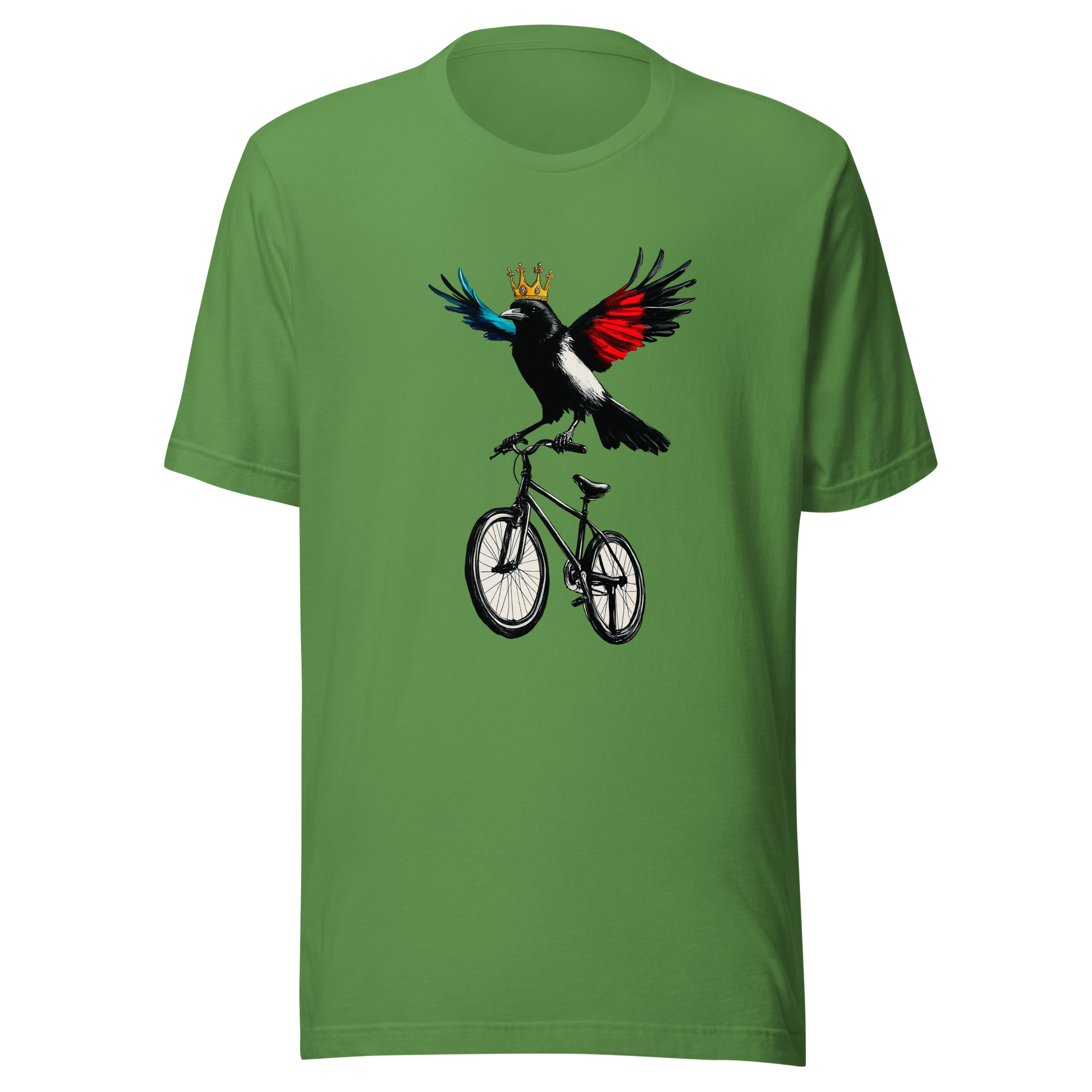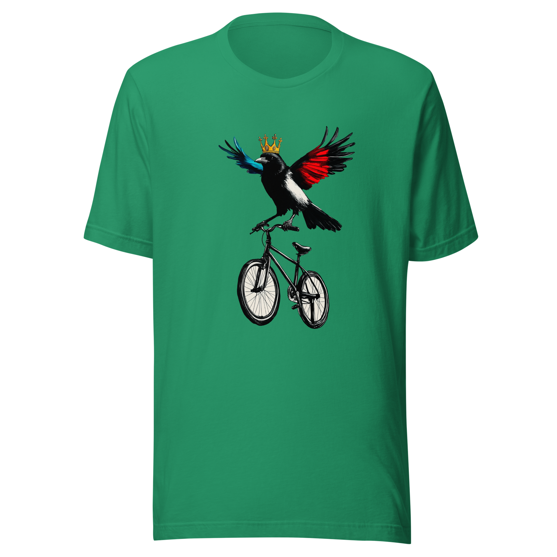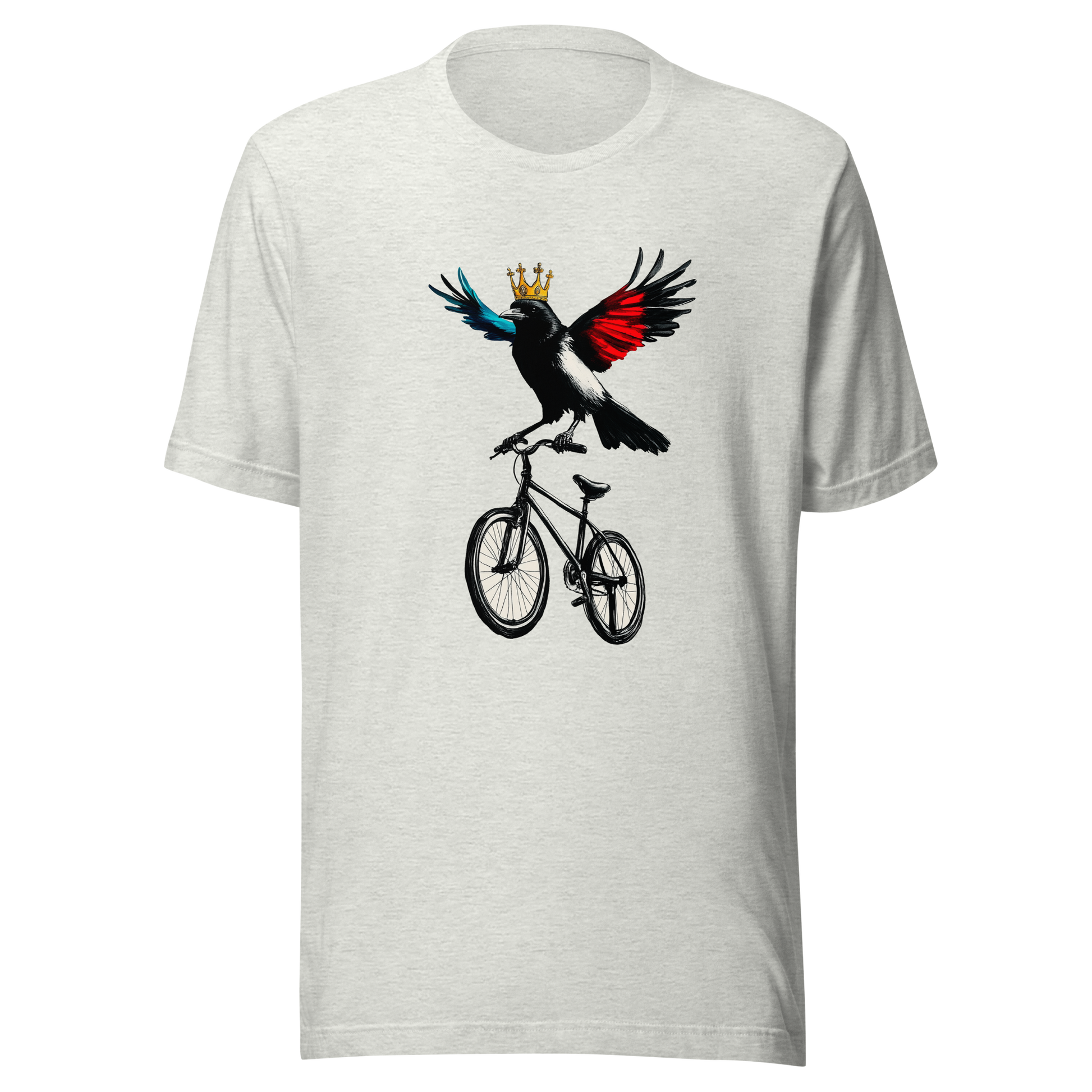In a world where the unexpected often becomes the norm, this t-shirt captures the bold spirit of a crow, not just flying, but taking the road less traveled—on a bicycle. It’s a design that speaks to the daring among us, those who forge new paths and redefine the limits of what’s possible.