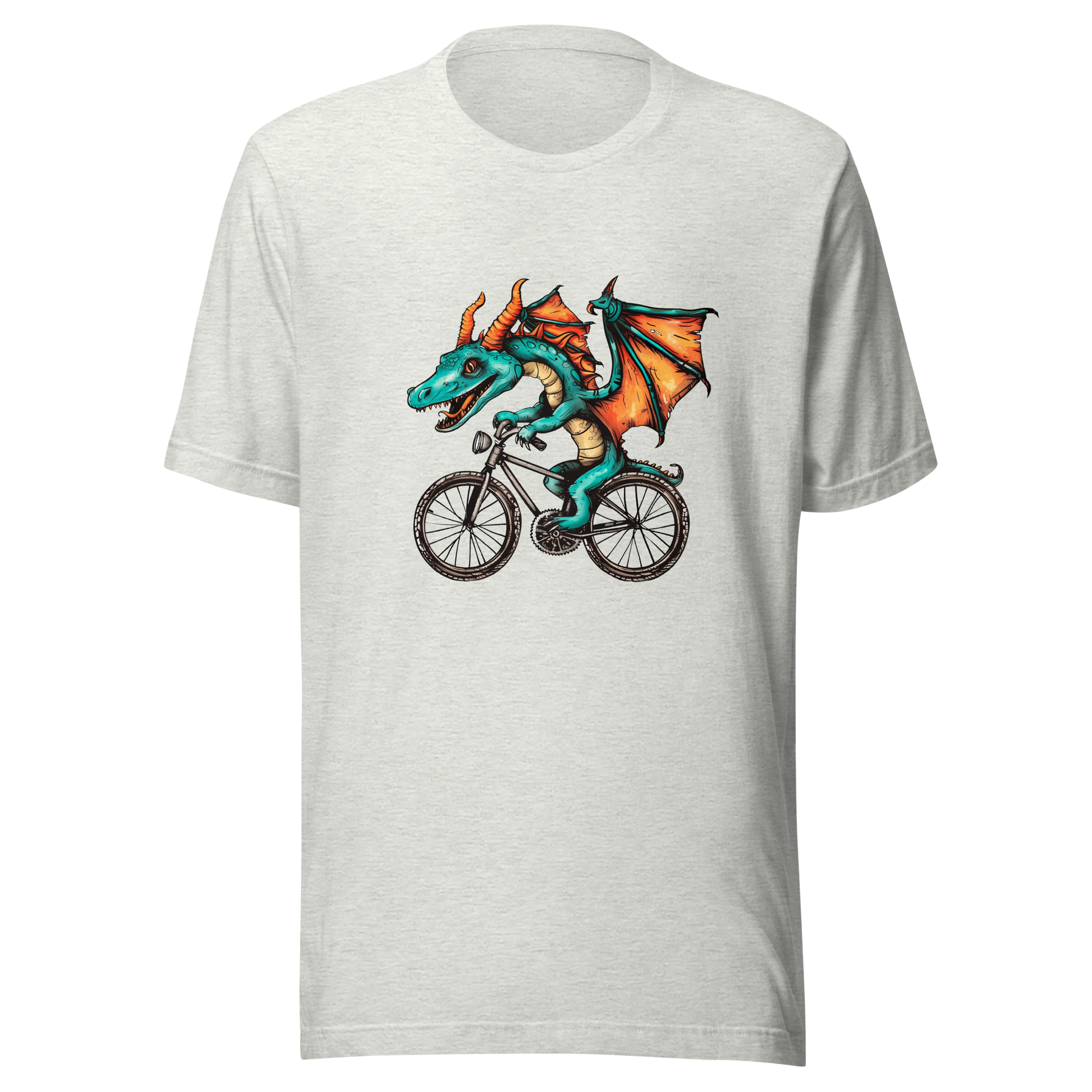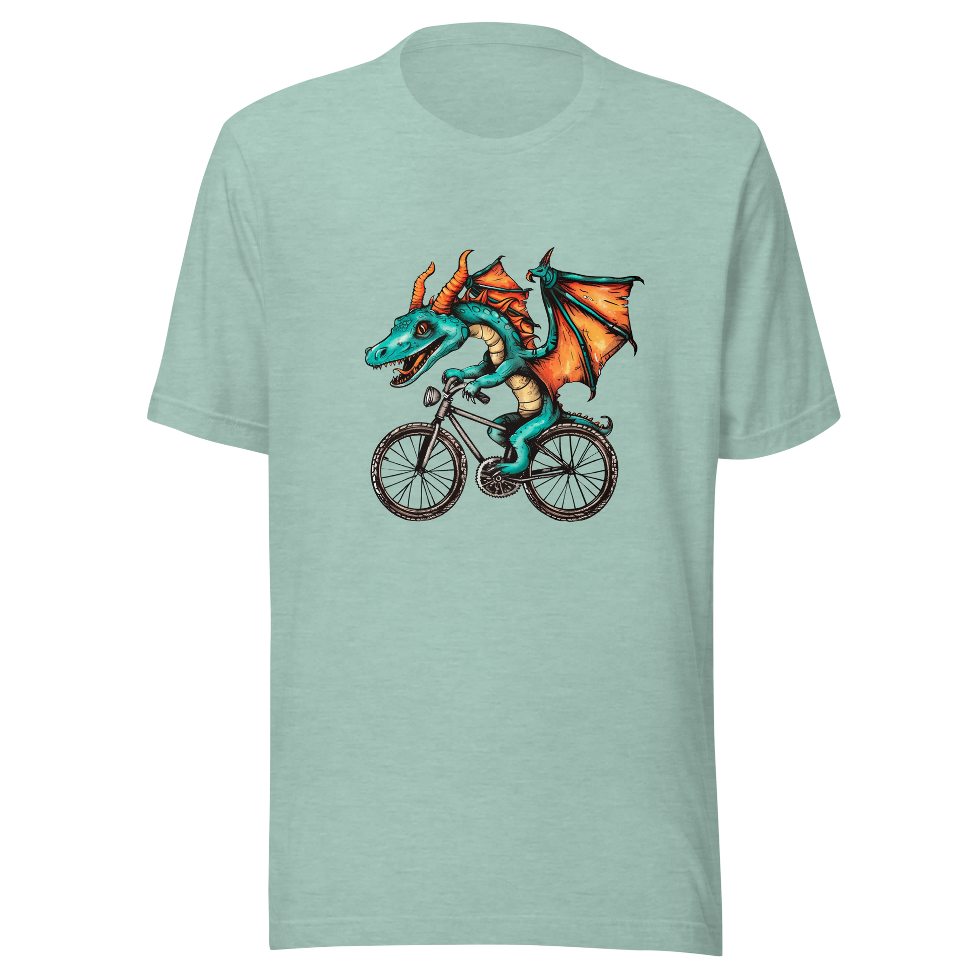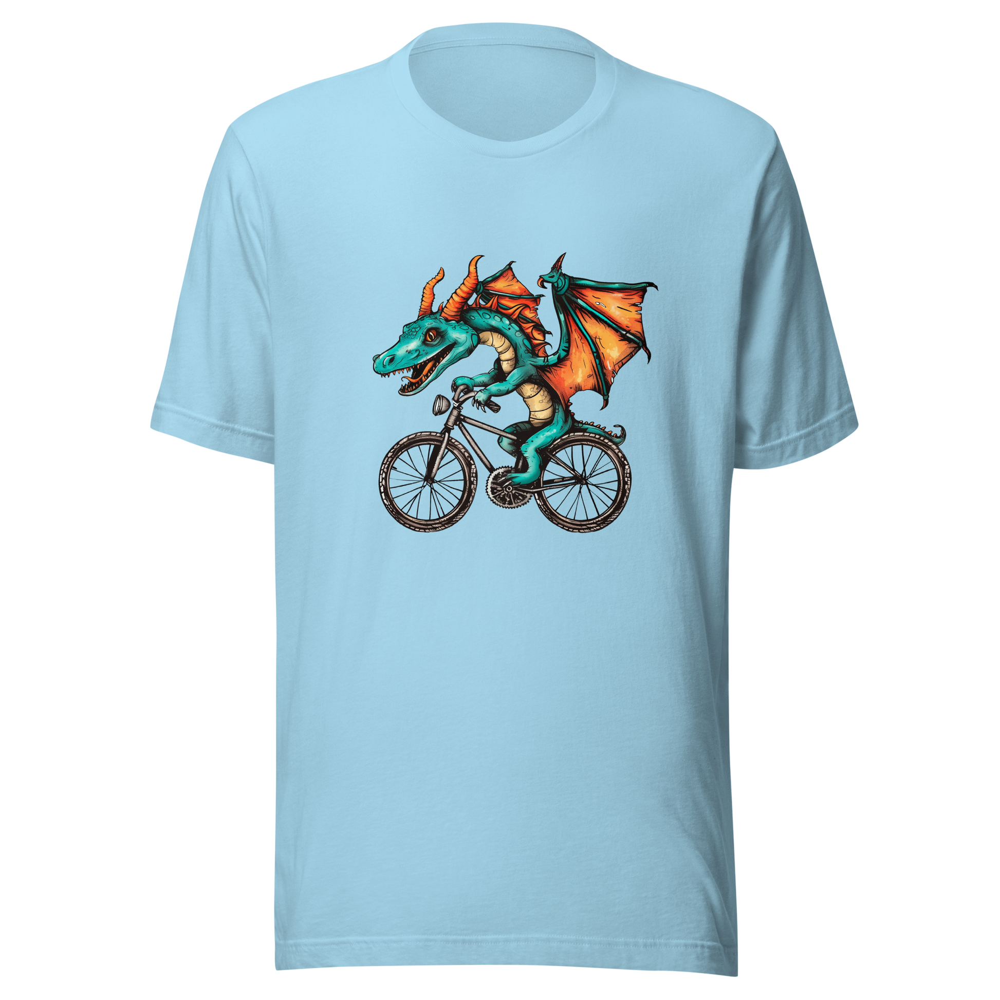 Who needs wings when you have a bike? This t-shirt features a dragon on a bicycle, blending mythical might with modern transportation.