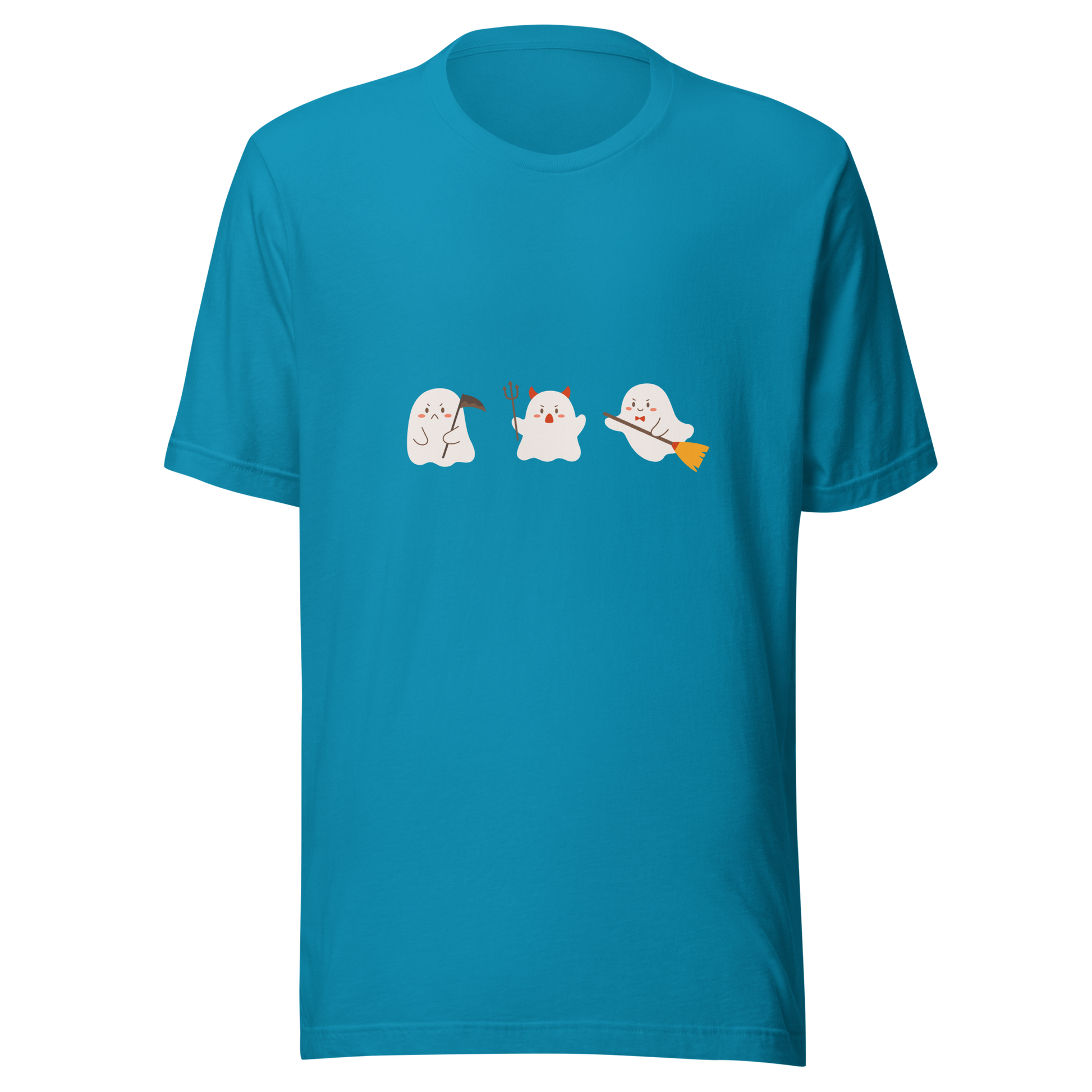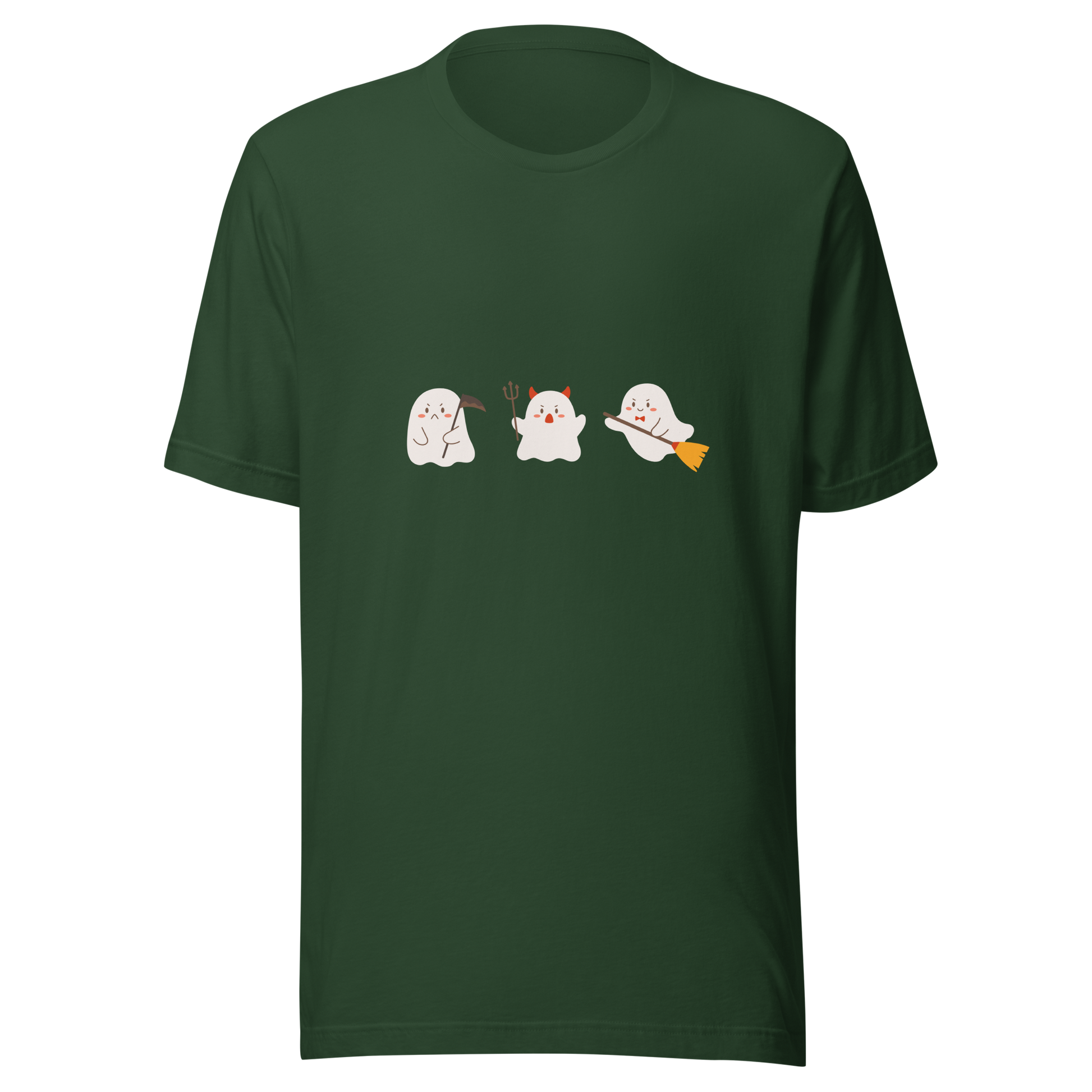 Imagine a spectral gathering where a ghostly Death, a devilish specter, and a witchy apparition come together for a spooky soiree. This t-shirt captures their ethereal presence with a whimsical twist, making it an ideal pick for Halloween enthusiasts and those who appreciate a good ghost story. It’s all about celebrating the eerie and the enchanting.