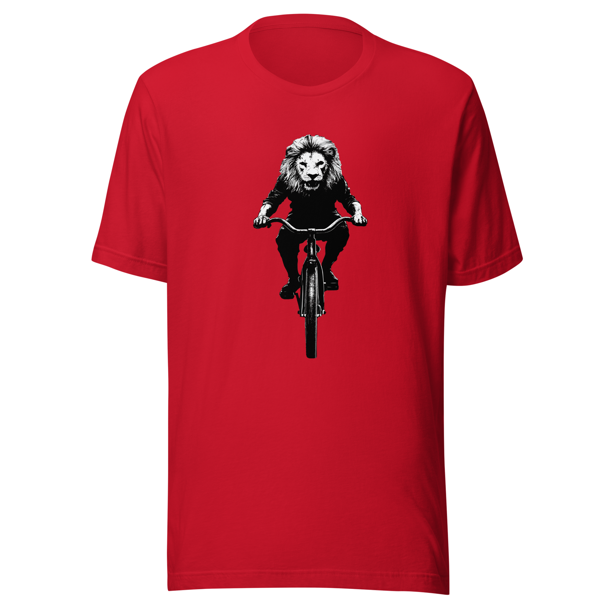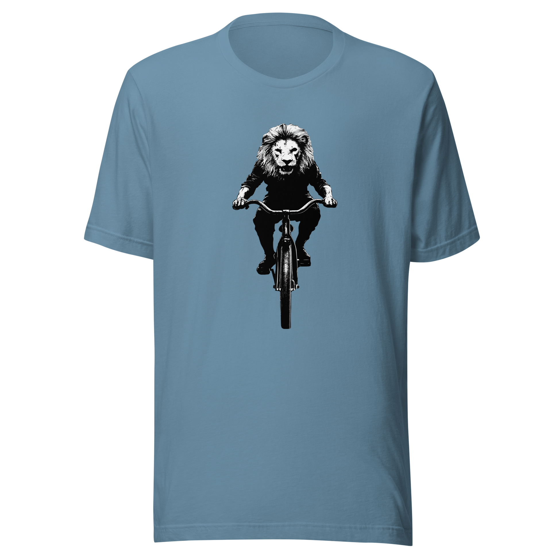 This t-shirt captures a lion’s adventurous spirit as it pedals through the urban jungle. Ideal for animal lovers and cycling enthusiasts alike. Ride with the confidence of a king!