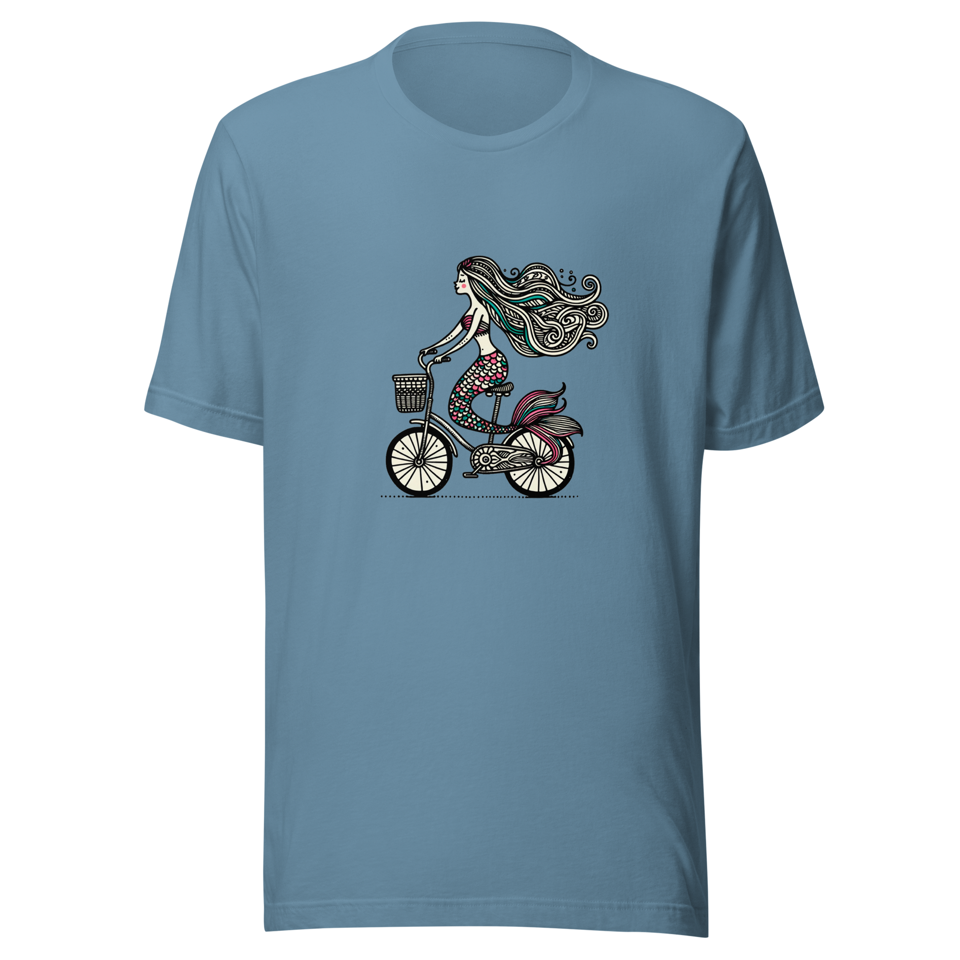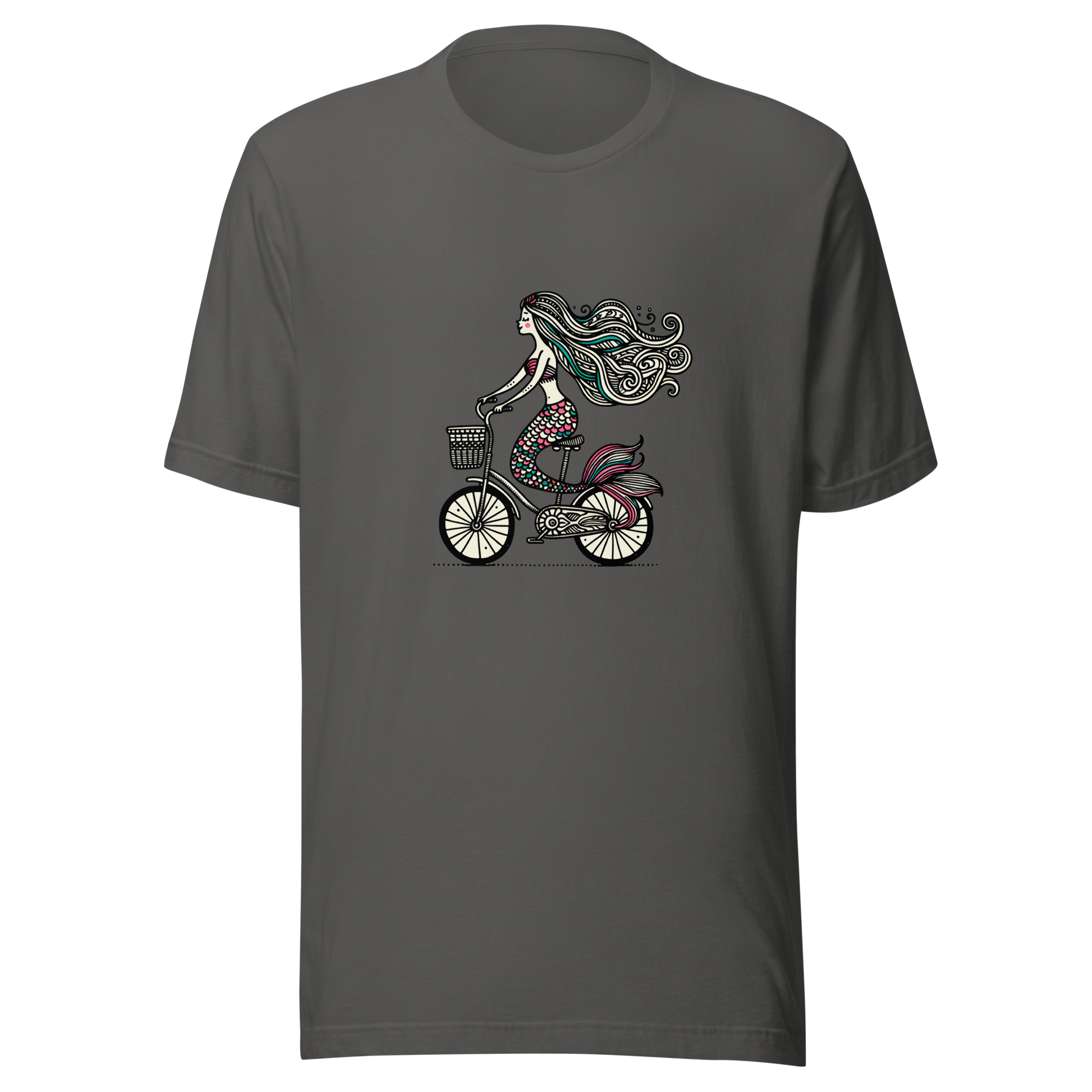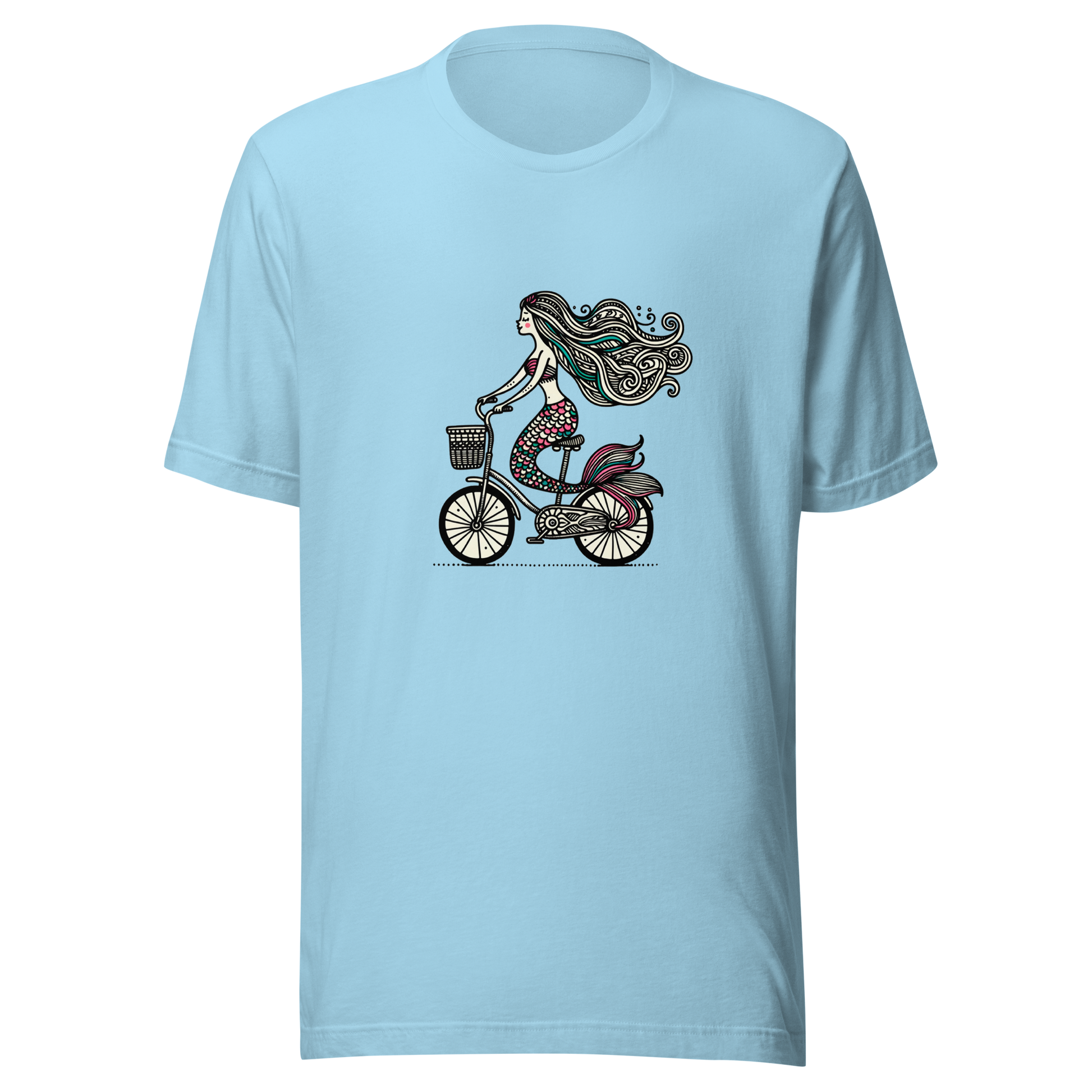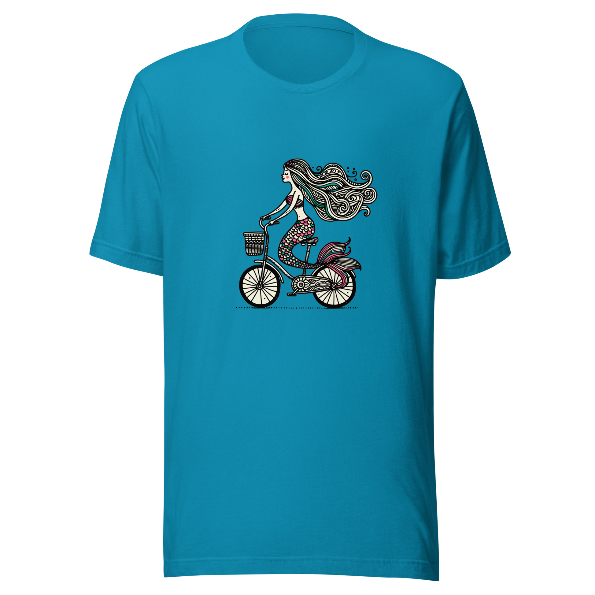 This mermaid prefers a bicycle to the waves. With a playful print of a mermaid on a bike, this t-shirt adds a splash of humor to your wardrobe.