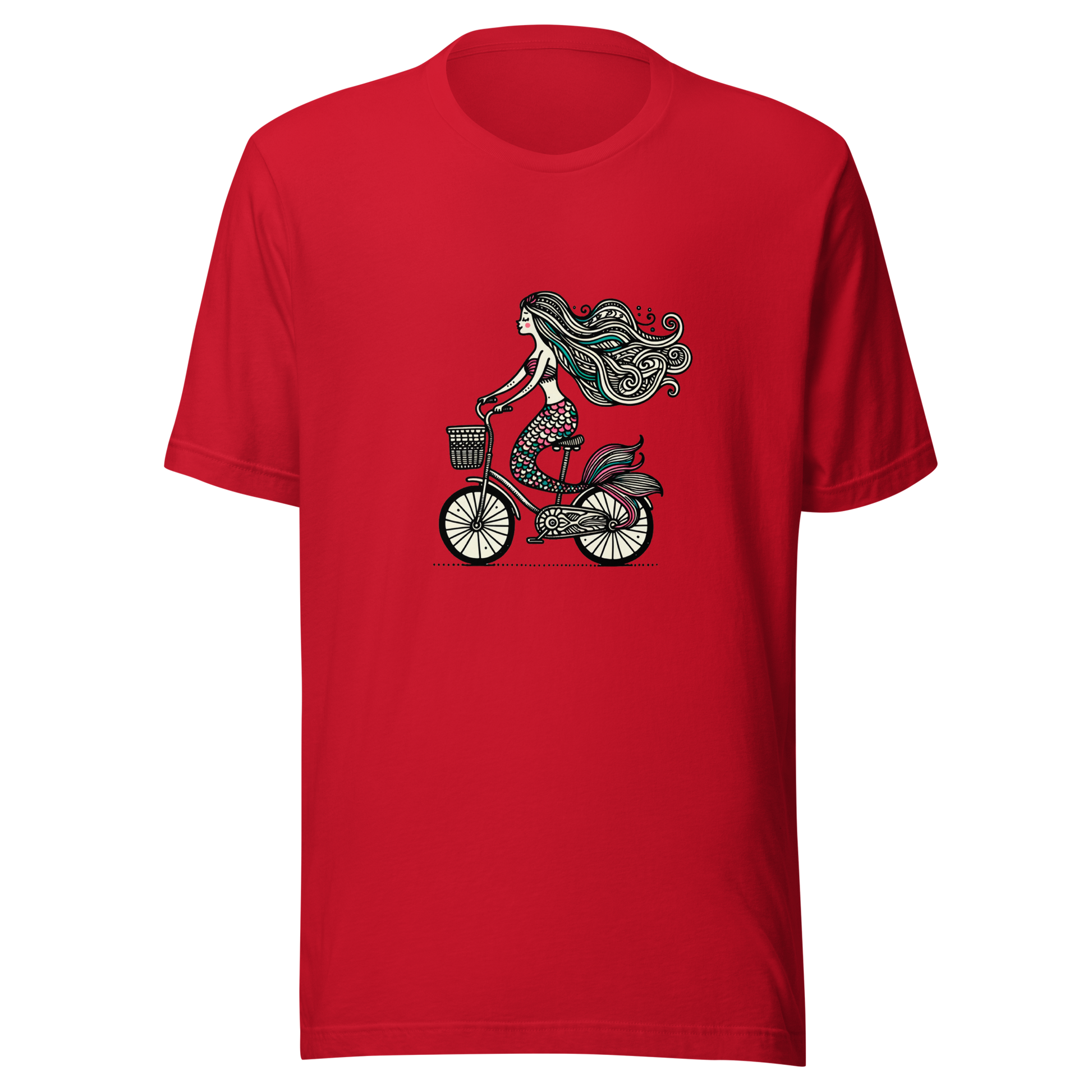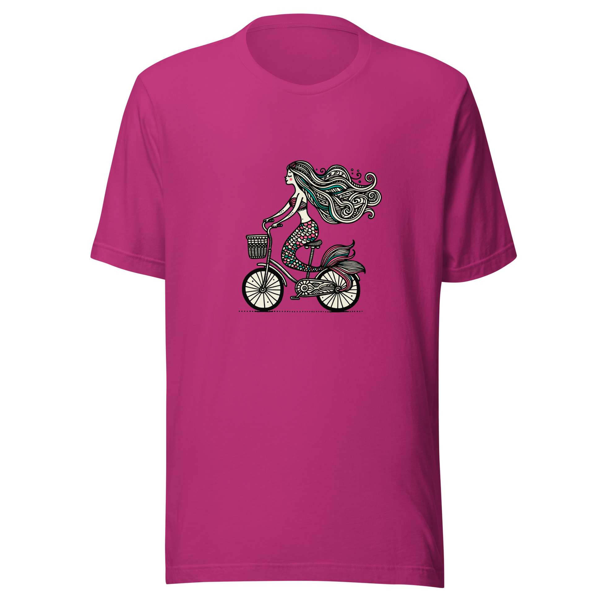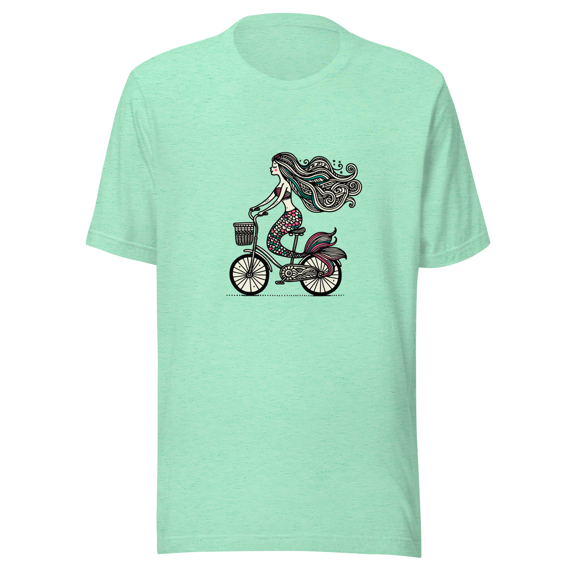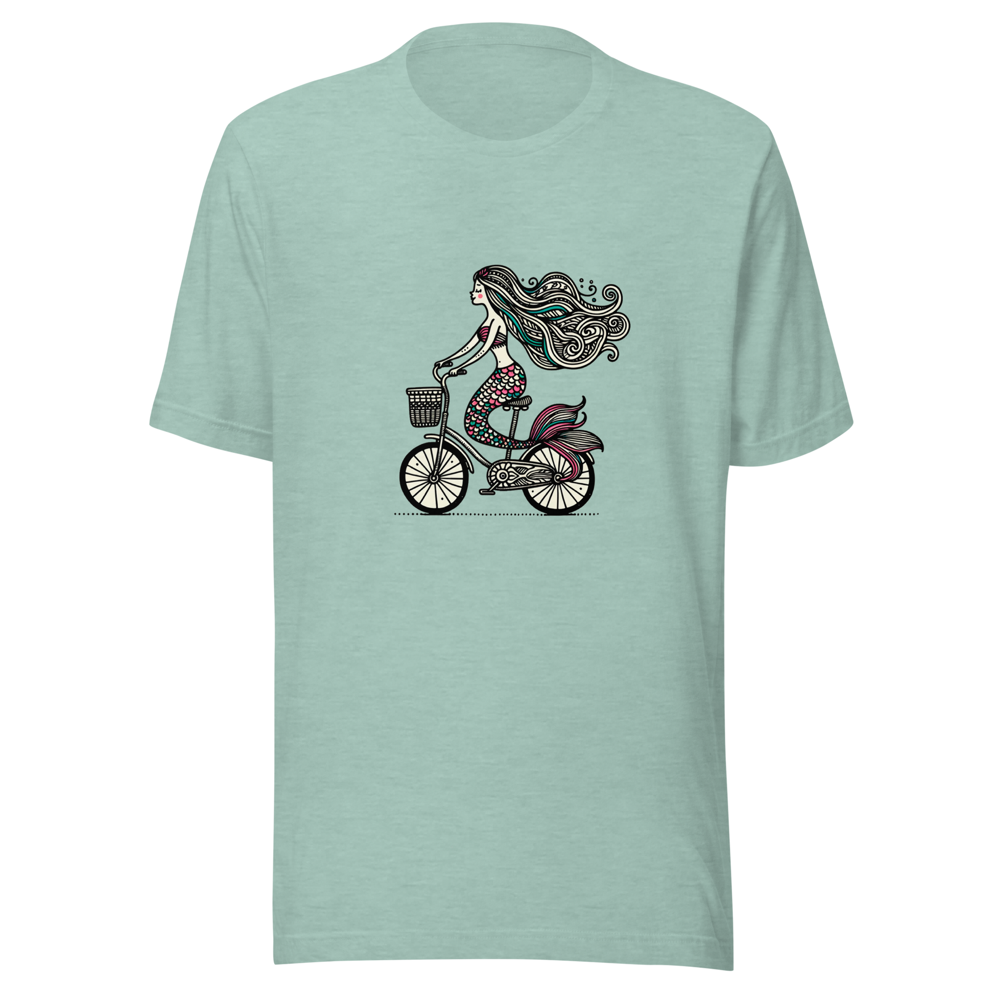 This mermaid prefers a bicycle to the waves. With a playful print of a mermaid on a bike, this t-shirt adds a splash of humor to your wardrobe.