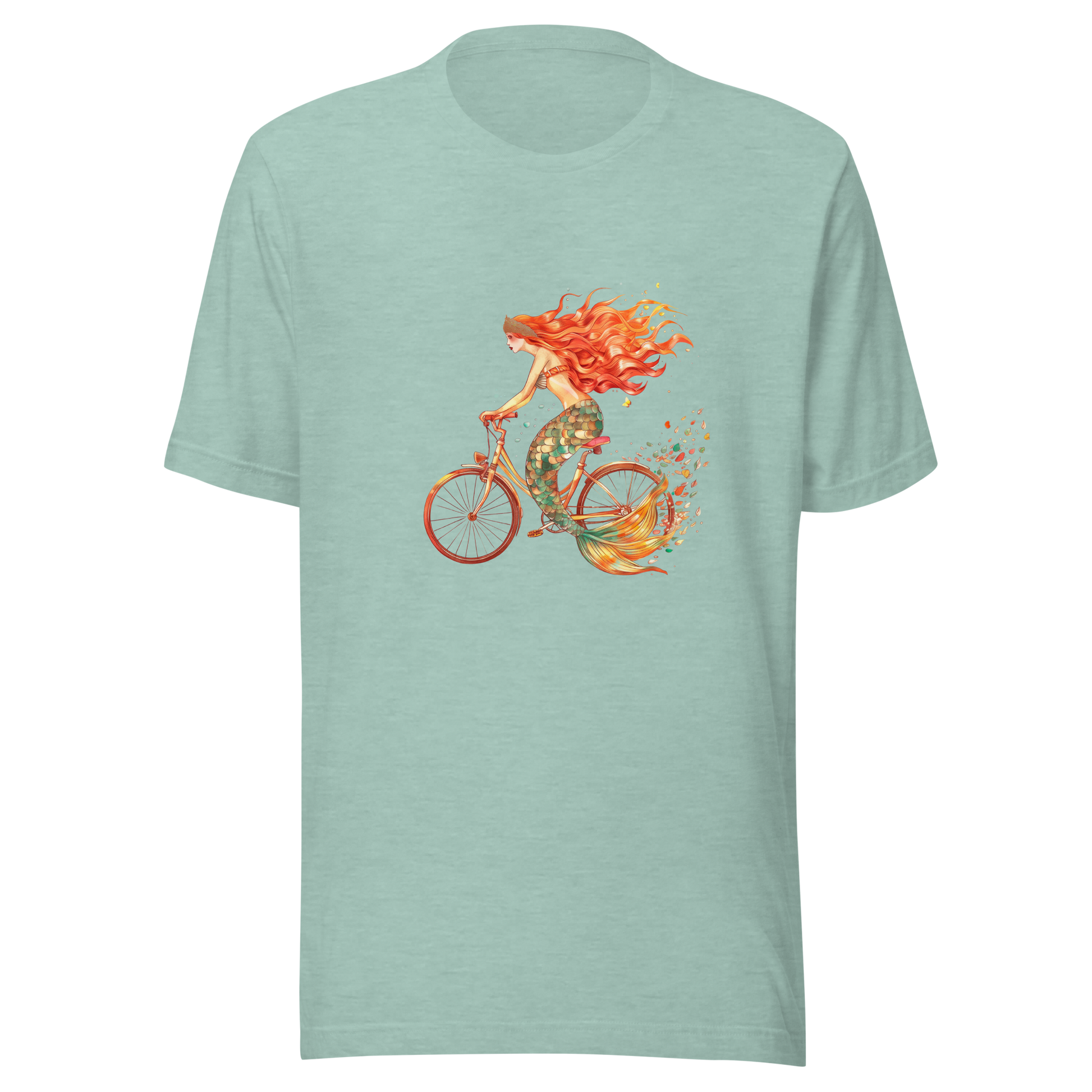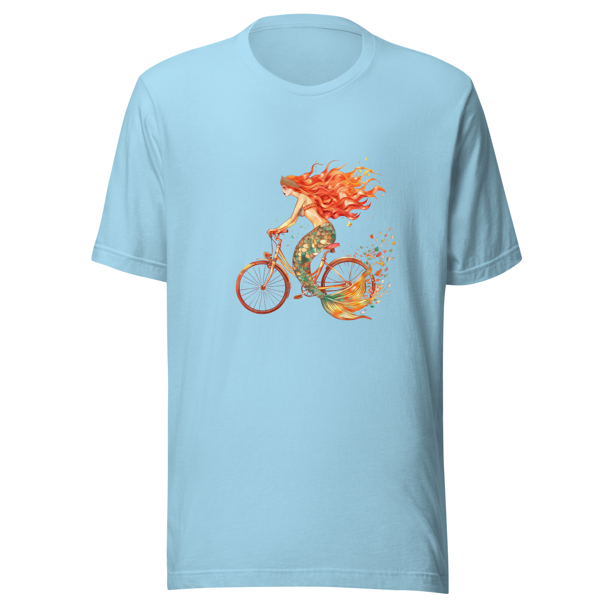 Forget swimming, this mermaid's got bicycle! Our t-shirt showcases a delightful mermaid riding a bicycle, blending land and sea in the most unexpected way. Ideal for anyone who enjoys a quirky twist on mythical creatures. Peddle your way into a sea of smiles!