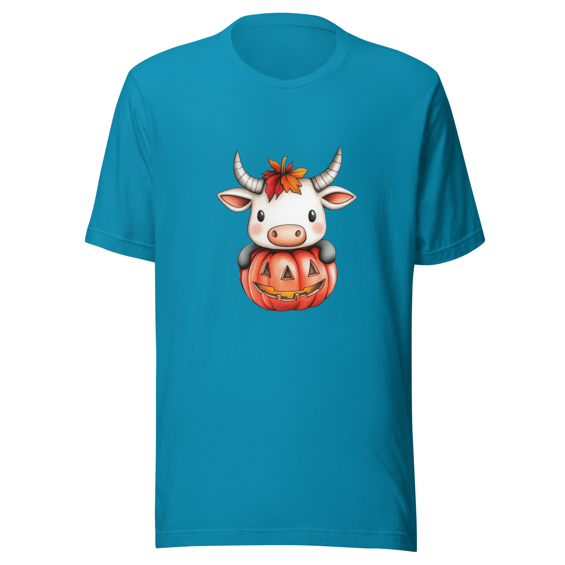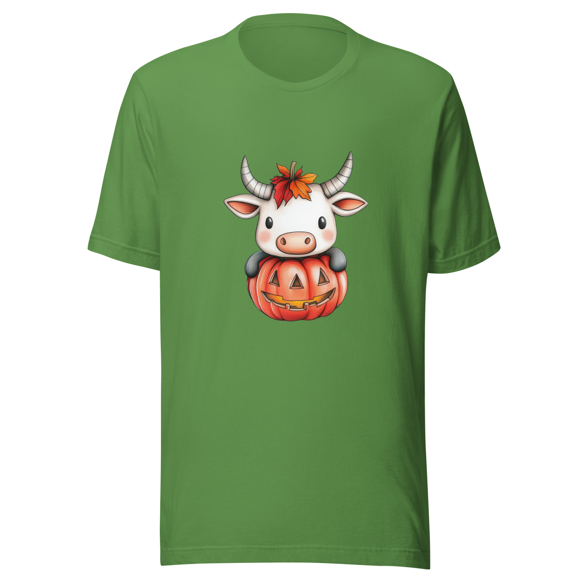 This t-shirt features an adorable Halloween-themed design with a cute cartoon cow peeking out of a jack-o'-lantern. The jack-o'-lantern has the traditional carved face and is a bright orange color, creating a charming contrast with the cow.