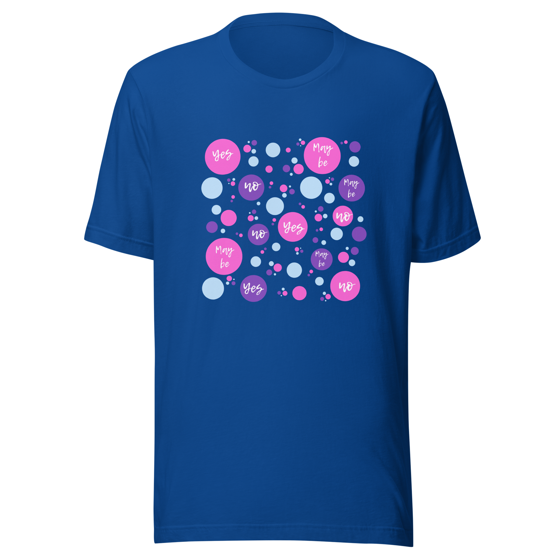 Unisex t-shirt with circles and words "Yes, No, Maybe"