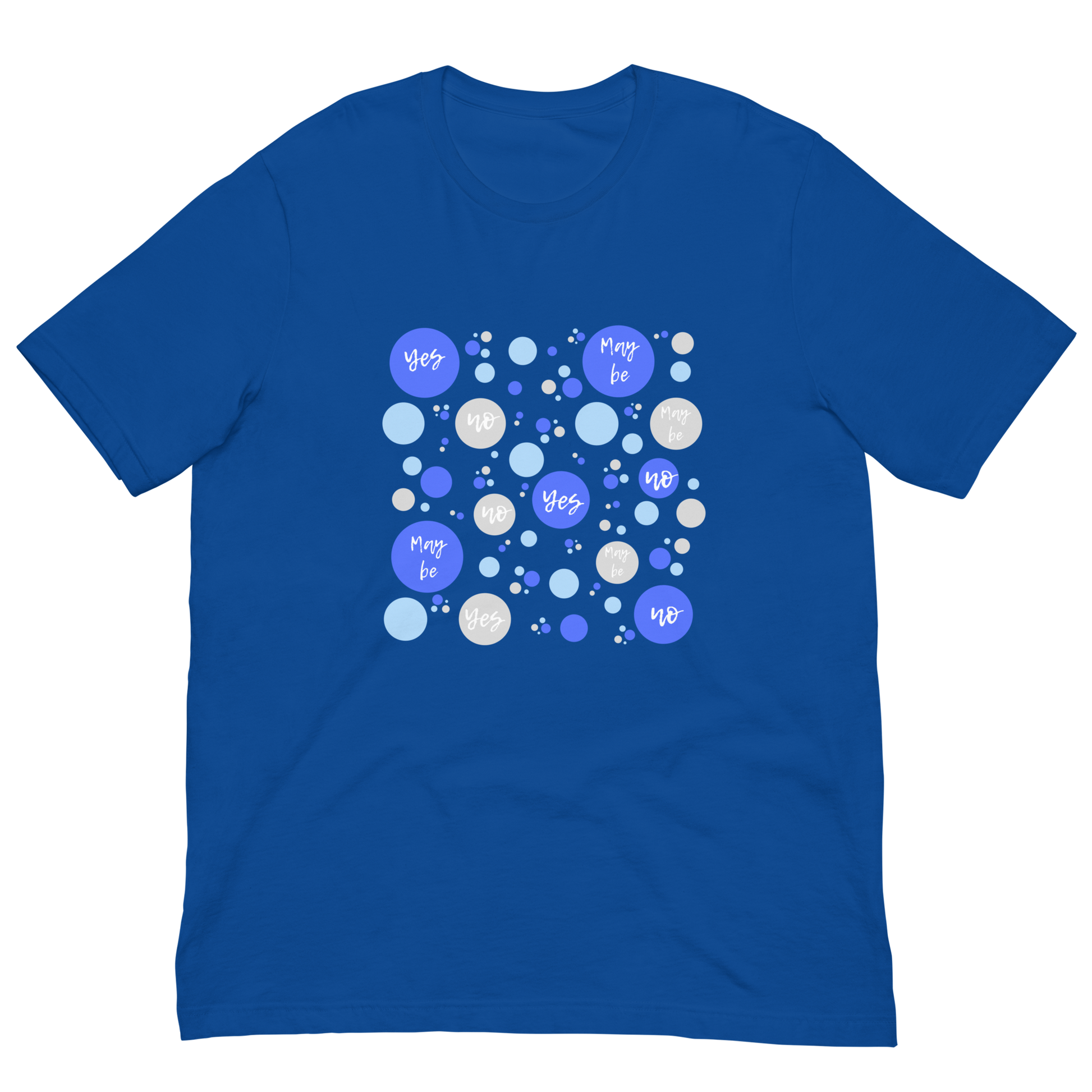 Unisex t-shirt with colorful circles - "Yes, No, May be".