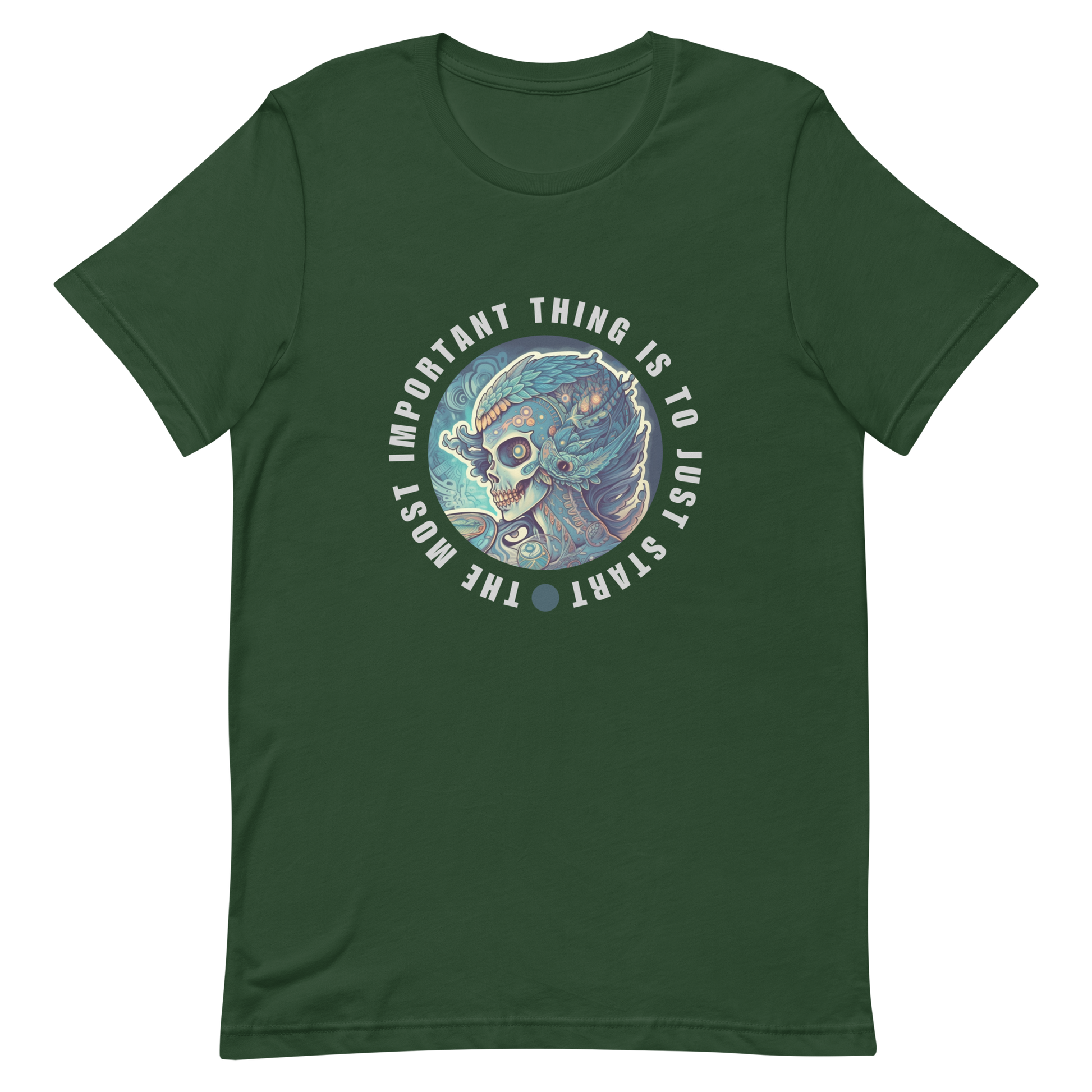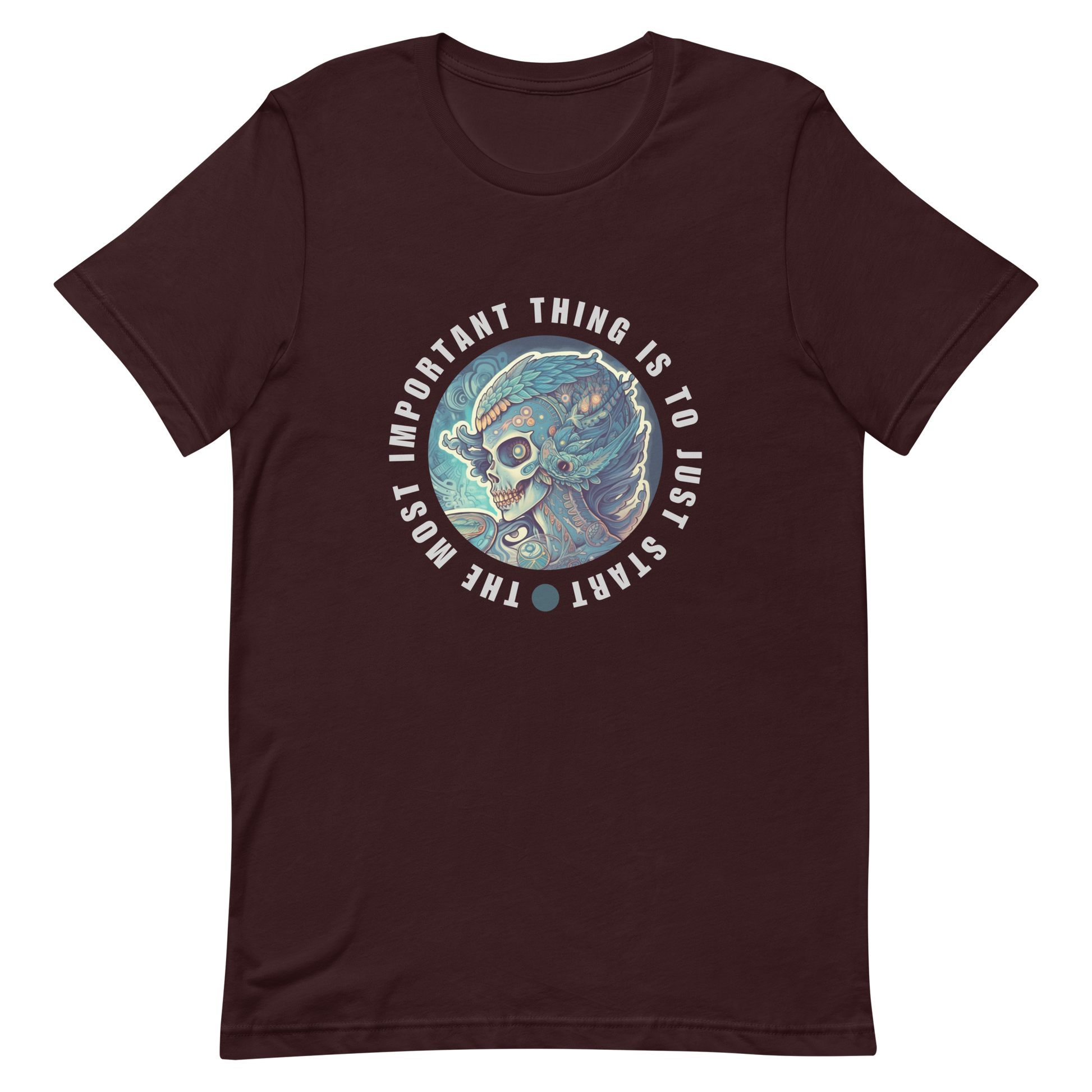 The t-shirt emblazoned with the words "The most important thing is to just start" is a powerful reminder of the value of taking action and not being afraid to start, even if it feels daunting or overwhelming at first.